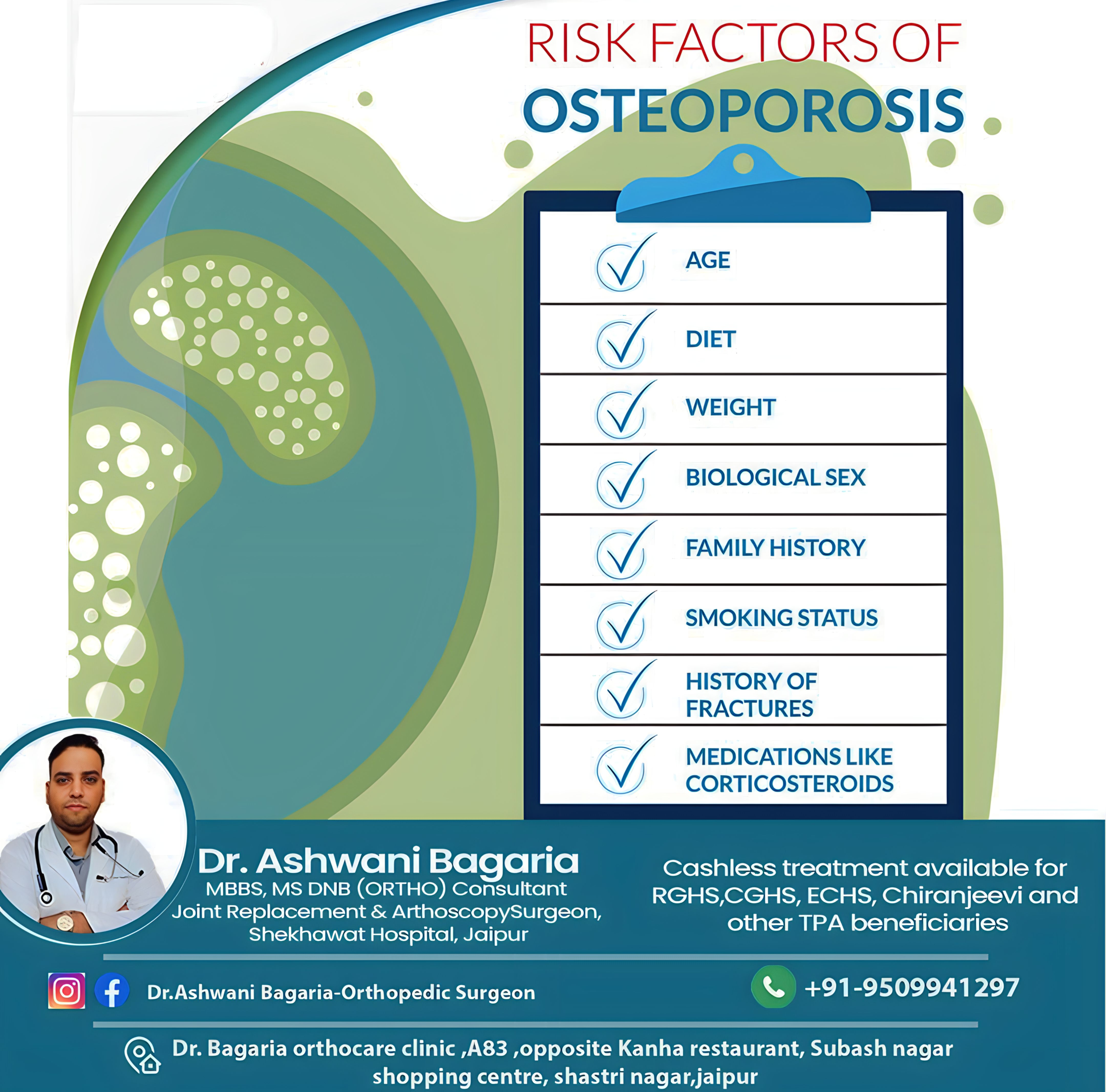 Dr. Ashwani Bagaria, a renowned orthopaedic surgeon in Jaipur, highlights key risk factors for osteoporosis. Aging, gender (women at higher risk), menopause, low calcium intake, sedentary lifestyle, smoking, excessive alcohol consumption, family history, and certain medical conditions contribute to bone loss. Regular check-ups and adopting a healthy lifestyle can help prevent osteoporosis. #bonepain #jointpain #totalkneereplacement #tkr #thr