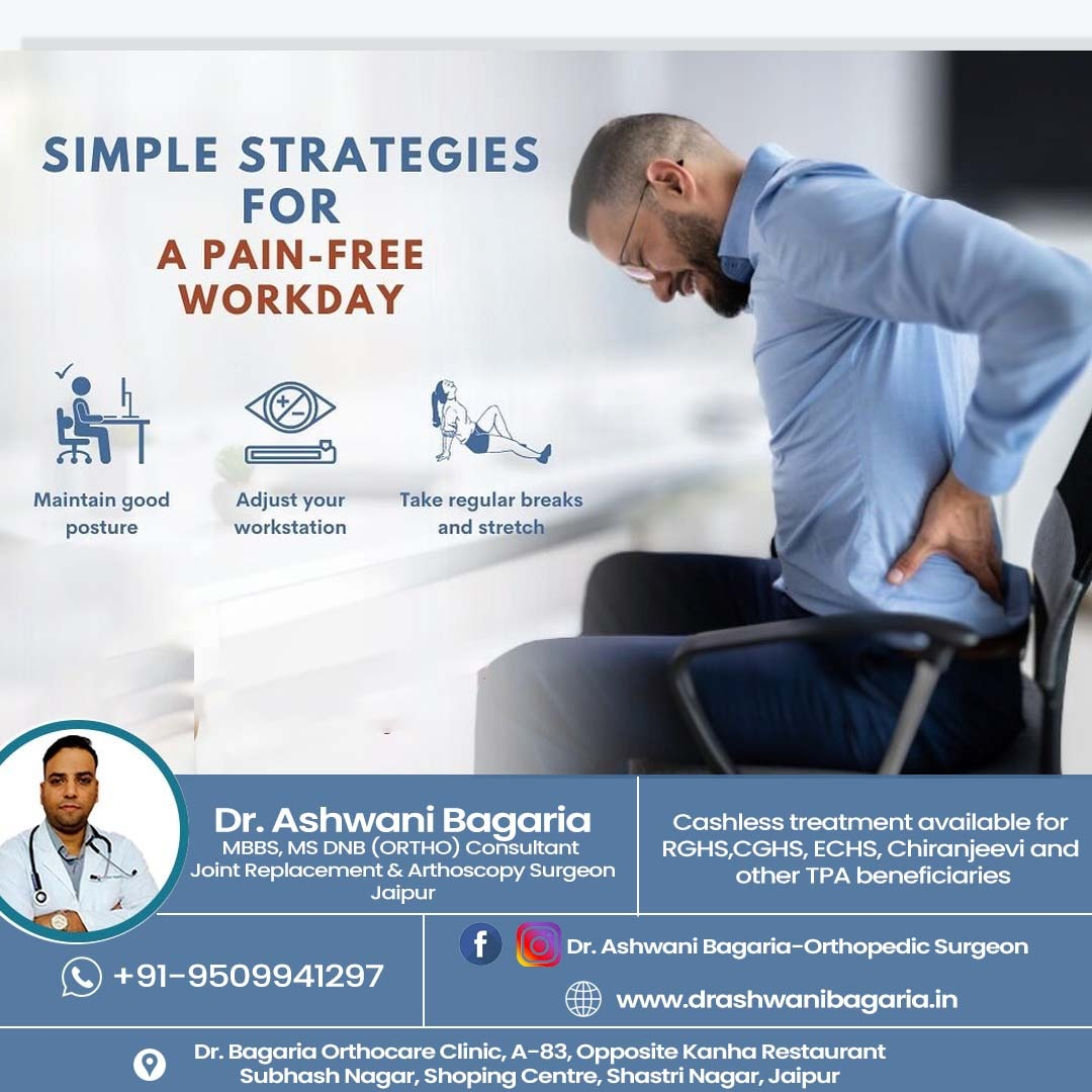 Embrace a pain-free work routine with Dr. Ashwani Bagaria's expert advice! Start by prioritizing good posture—maintain a neutral spine alignment and support your body's natural curves. Take regular breaks to prevent stiffness and enhance circulation, while incorporating simple stretches to release tension. Additionally, optimize your workstation by adjusting chair height, desk ergonomics, and screen position. These small changes can make a significant impact on your comfort and well-being. Elevate your work experience with these holistic strategies for a healthier, more productive day. 💪🏽💼 #Drashwanibagaria #bestorthopaedicsurgeon #hippain #WorkWellness #PostureHealth #ProductivityTips